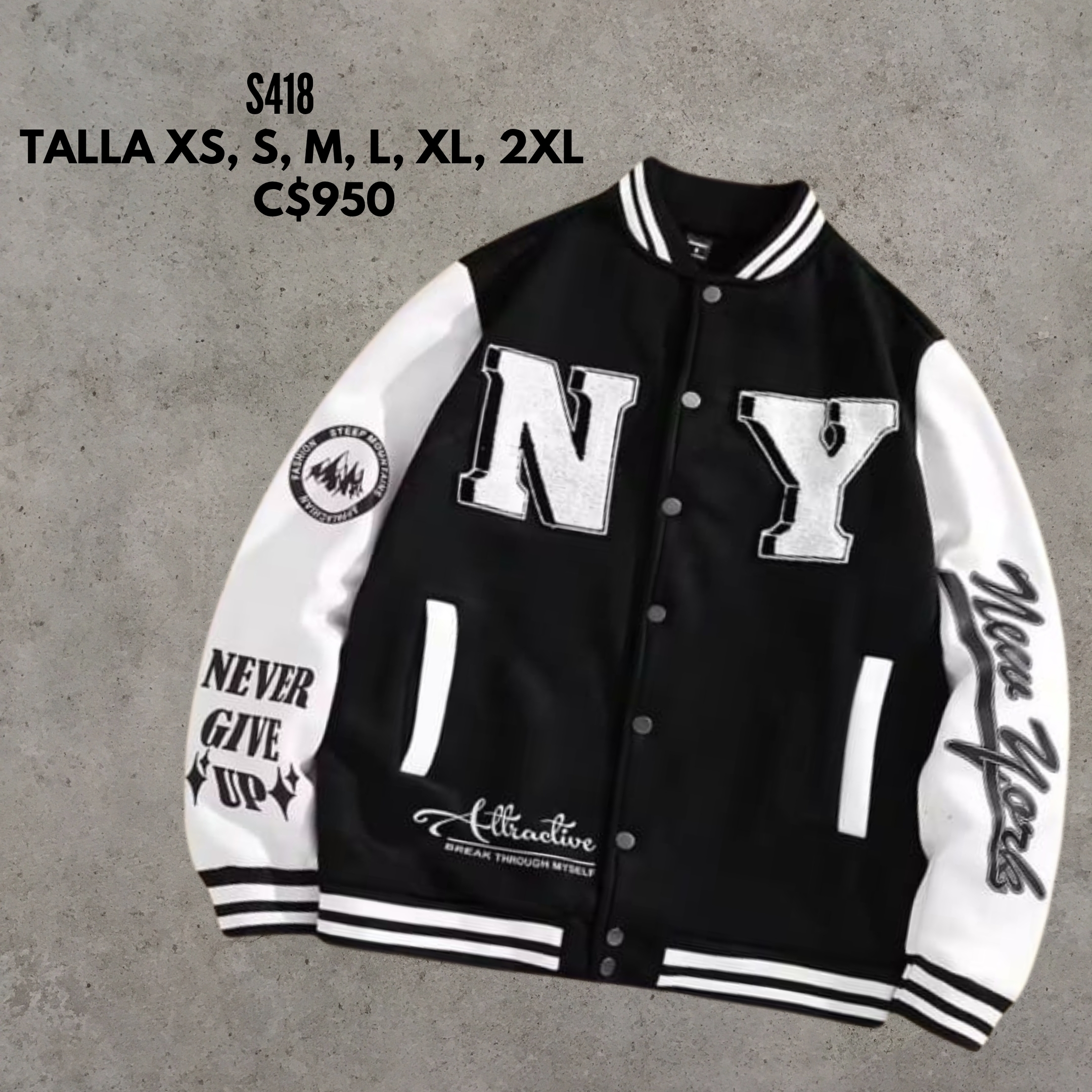 Chaqueta estilo universitaria, mangas color blanco.
