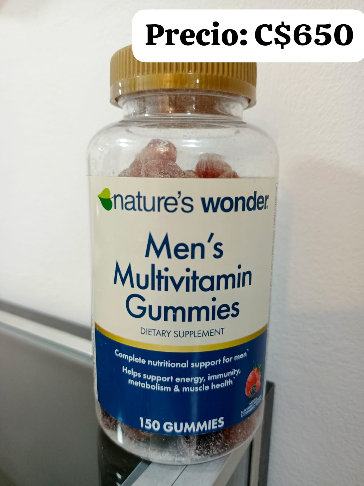 Nature’s Wonder™ Men’s Multivitamin Gummies Contenido: 150 gomitas | Suplemento Dietético Una fórmula completa y deliciosa diseñada especialmente para el bienestar masculino. Estas gomitas multivitamínicas ofrecen el soporte diario que los hombres necesitan para mantenerse activos, saludables y en equilibrio. Beneficios clave: Energía diaria: Ayuda a mantener los niveles de energía y vitalidad para enfrentar el día a día. Refuerzo inmunológico: Con vitaminas esenciales que fortalecen las defensas naturales del cuerpo. Apoyo al metabolismo: Estimula un metabolismo saludable y eficiente. Salud muscular: Con nutrientes que favorecen el desarrollo y mantenimiento muscular. Sabor natural a fresa y en presentación masticable, ideal para quienes prefieren evitar tabletas o cápsulas. Especialmente formulado para hombres que buscan una solución práctica, sabrosa y efectiva para su salud integral.
